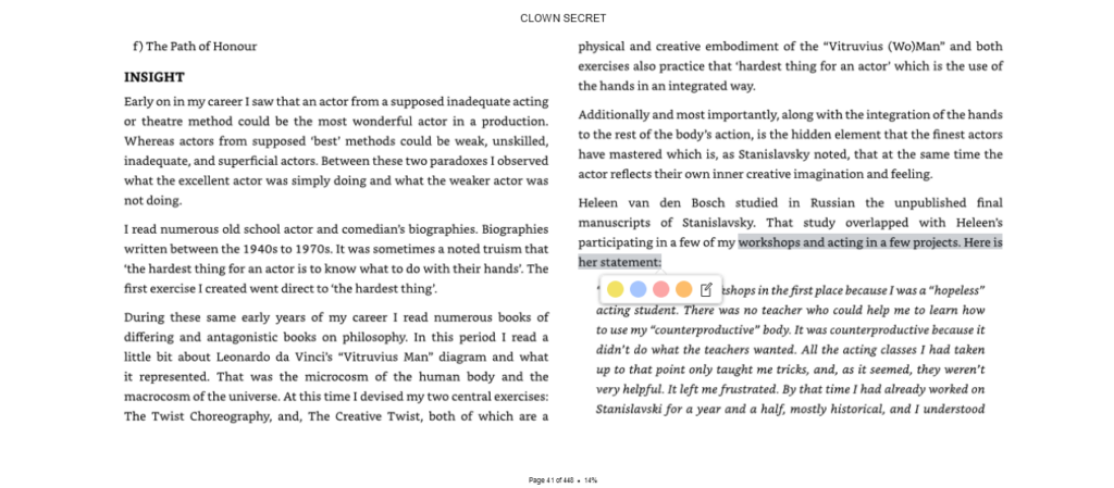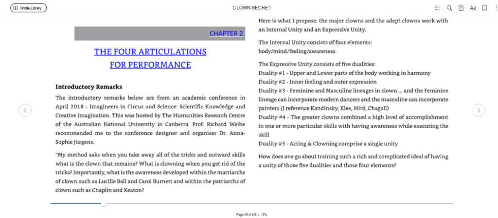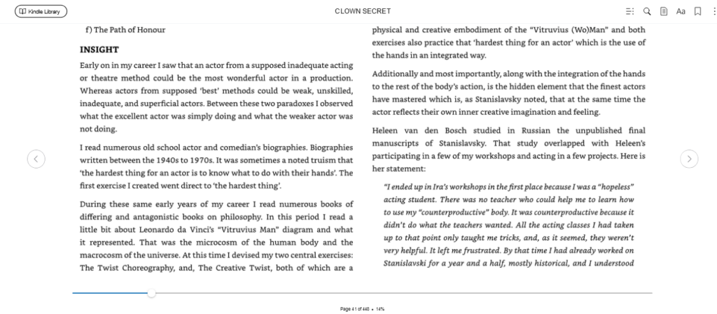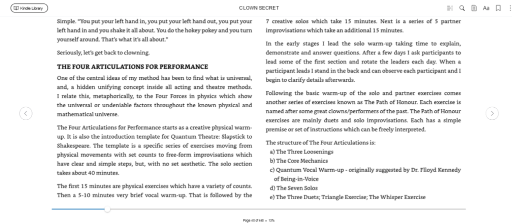 Naturally most people try to avoid struggle. But for an artist struggle is the DNA of being an artist. Chapter 2 of Clown Secret is the template of exercises that I recommend for performers. This blog/essay includes the first few pages of Chapter 2 of Clown Secret. The exercises and their instructions are extremely beneficial for any performer, as well as for teachers of performers and for directors and choreographers of performers. Like the book that Penn and Michael struggled with, there are instructions. In Clown Secret, there are step-by-step instructions and even clear directions of how to work with the instructions. Anyways, Michael’s art and ideas are wonderful!!