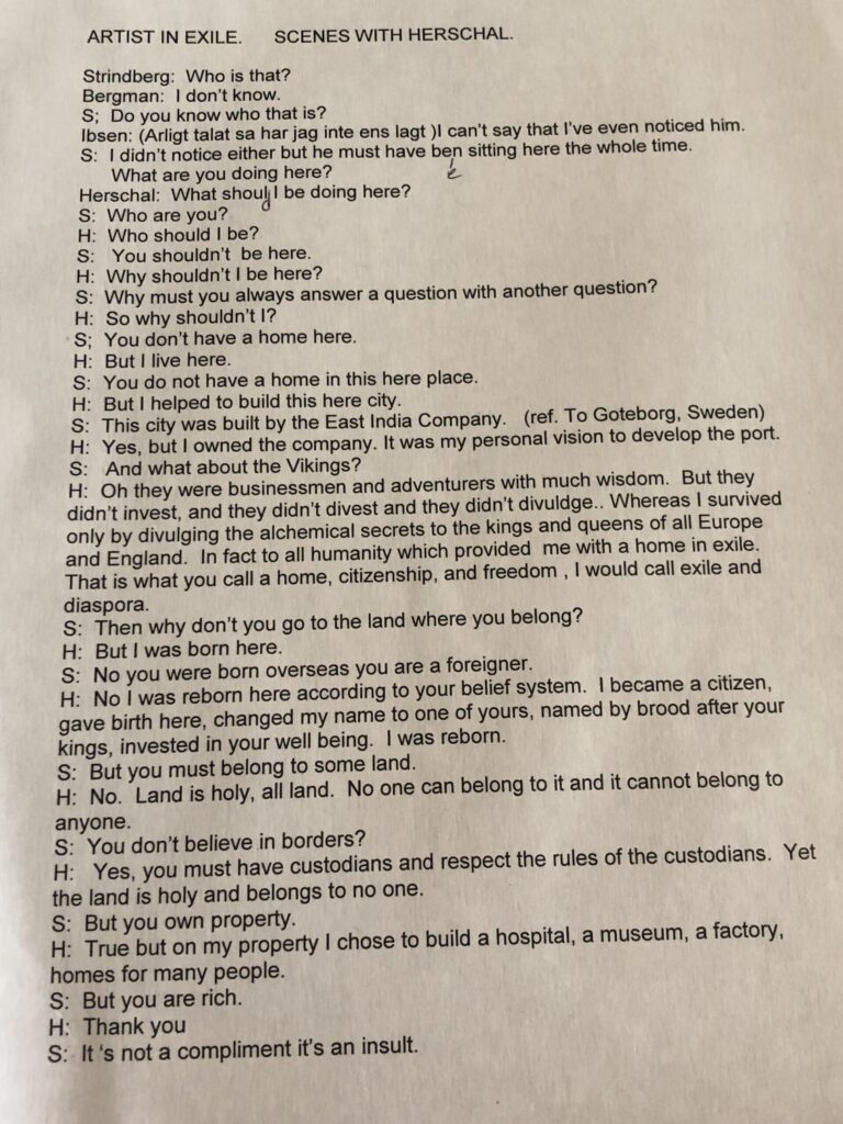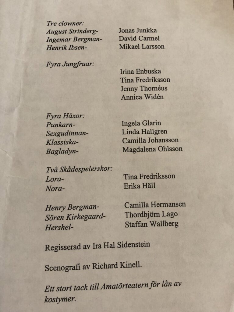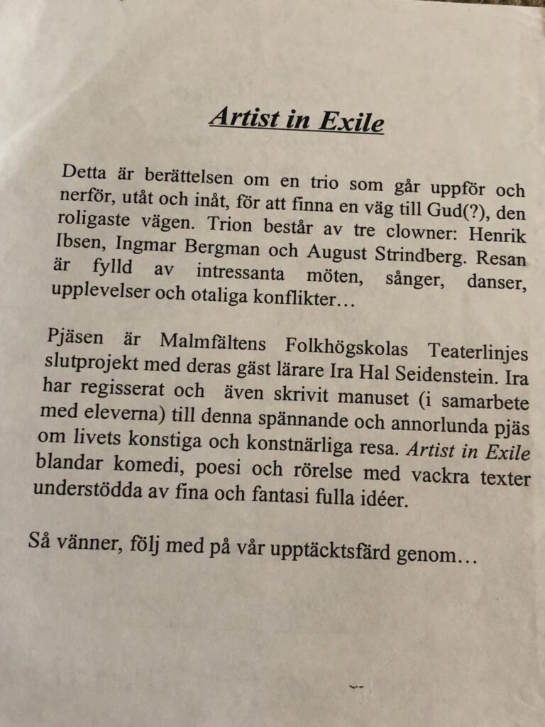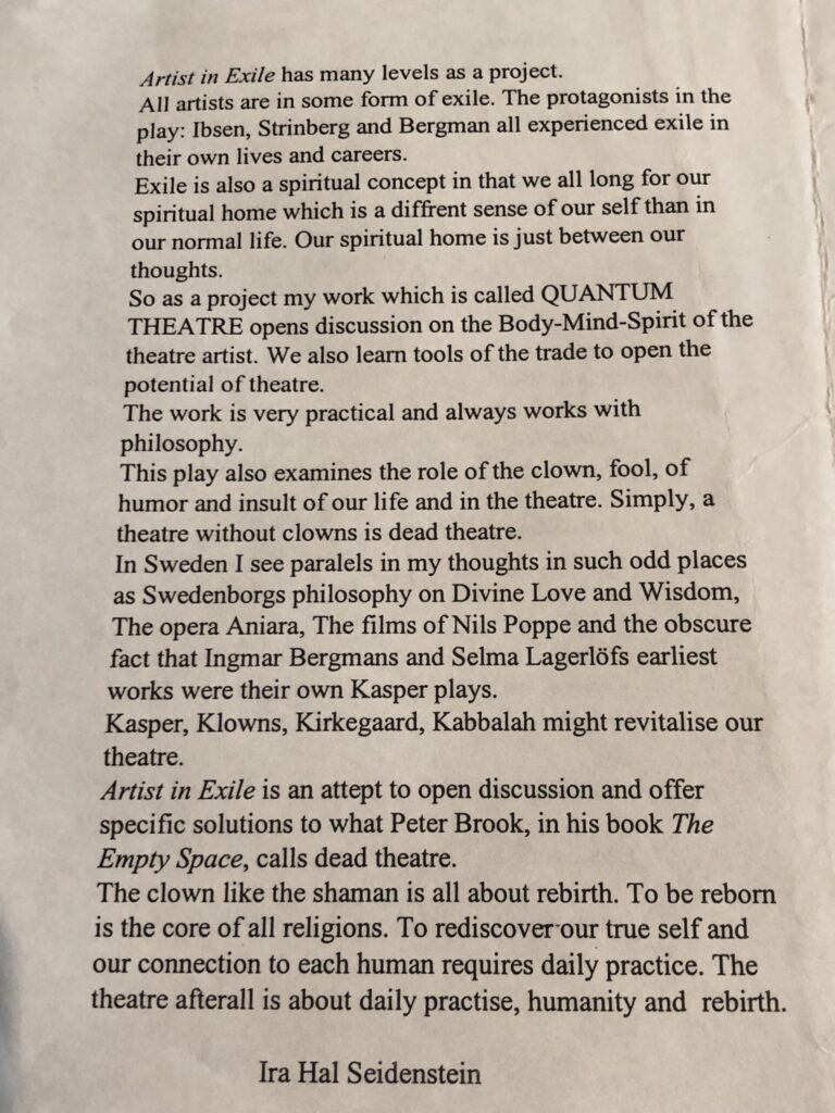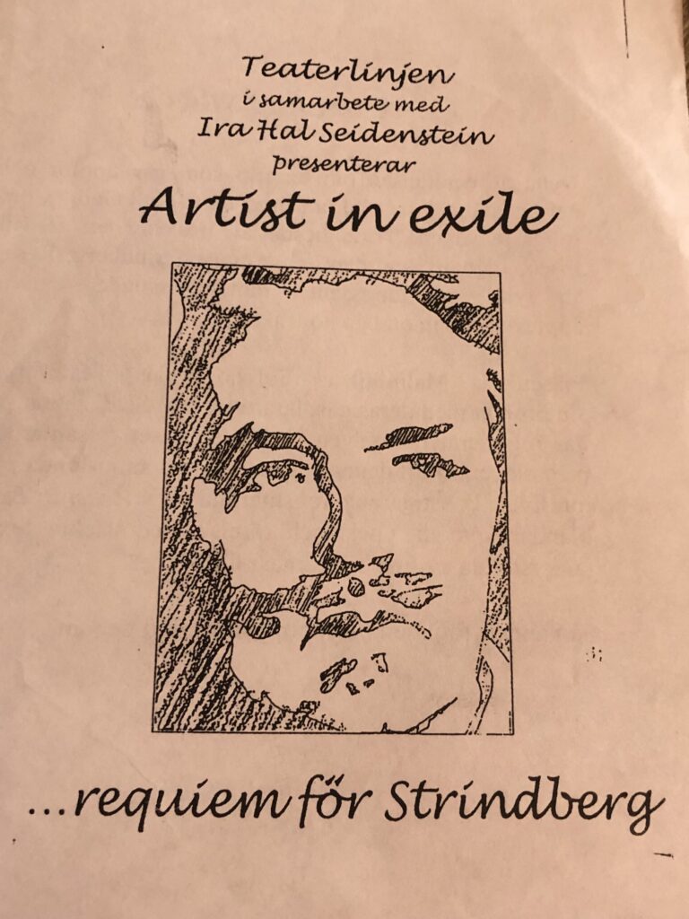 Now follows a description and some text from the final scenes of the play Artist in Exile… requiem for Strindberg. Importantly, when I write or create a play it is done collaboratively. First thanks to the Actors with whom we spent two periods together. First was about 10 days or two weeks. Then perhaps a month or so to fully create the show and tour it to five northern Swedish towns including Kiruna our host for creation and Lulea. Thanks to each Actor – the cast list is later in this blog. I want to thank our colleague and producer Kjell Peder Johanson who ran the Theatre course and was a wonderful colleague!!! Last but not least I want to thank Niclas Abrahamsson who trained with me in Goteborg. He was a musician already and likely a writer. He translated my first parts of the play which I wrote in English. Additionally, the Actors assisted with the text development during the creation and rehearsal.