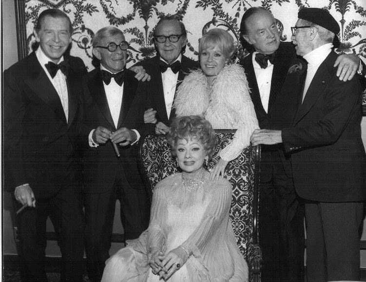 Photo: Lucille Ball honoured by a charity group. Photographed with fellow legendary clowns: Milton Berle, George Burns, Jack Benny, Debbie Reynolds, Bob Hope, and Groucho Marx.