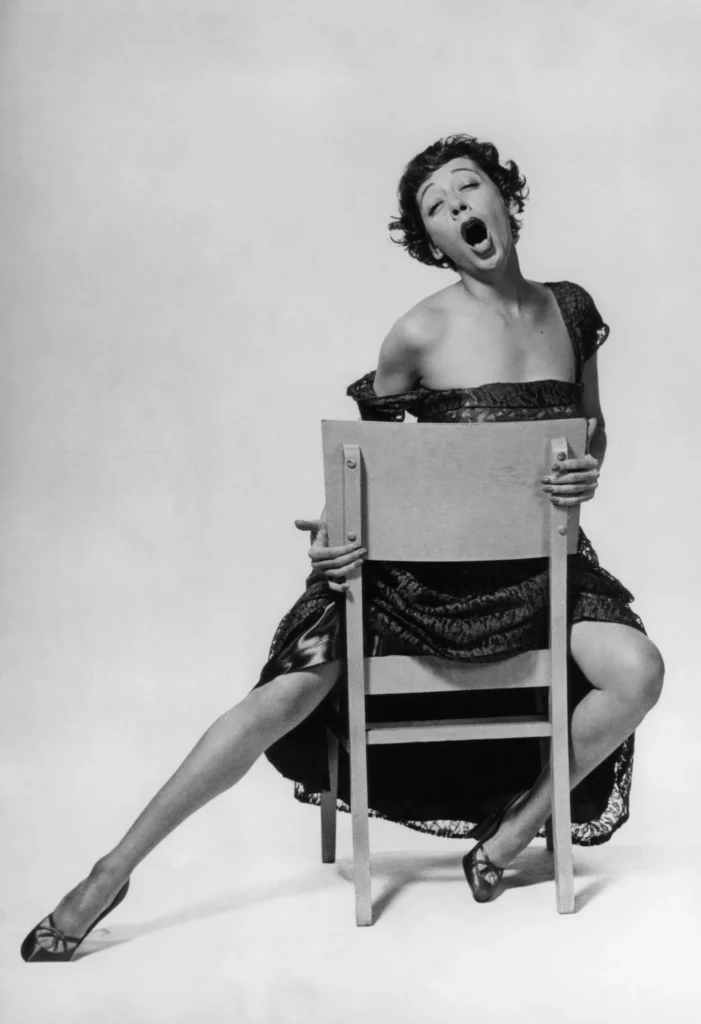 The comic element entered her act quite by chance in New Faces of 1934: during a rehearsal, the theatre was freezing cold, so the choreographer lent her his overcoat. She and three male dancers began to clown around, improvising silly dance steps in an effort to keep warm; the choreographer saw the comic effect and convinced them to repeat their routine in the show, complete with overcoat. It had the audience in stitches, and Imogene Coca’s career in comedy was born. She spent the next four summers working in the Poconos with comedians like Danny Kaye and Carol Channing, and played comic parts in three films, but back on Broadway she continued to sing and dance in revues until 1945. Robert Burton, whom she married in 1934, did most of her musical arrangements.”